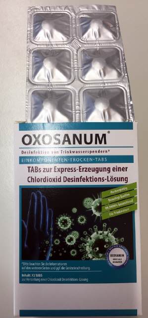 OXOSANUM®ist der innovative Ausgangsstoff (Precursor), mit dem vor Ort (in situ) das bewährte und sehr wirksame Biozid Chlordioxid erzeugt wird. Damit werden in wässrigen Lösungen sicher alle Arten von Mikroorganismen, wie pathogene Keime, Pilze, Viren oder Legionellen abgetötet. Gleichzeitig wird durch das aus OXOSANUM erzeugte Biozid vorhandener Biofilm abgebaut und die Bildung von neuem Biofilm nachhaltig verhindert. Es ist ebenso für die Beigabe in Tränkwässern oder die Desinfektion von wässriger Prozessmedien in der Industrie erfolgreich im Einsatz. Die OXOSANUM Produktfamilie bietet optimierte Hygienelösungen für die Trinkwasser-Desinfektion in zahlreichen Branchen. OXOSANUM Produkte stehen als Trocken-Mischungen, Tabs oder Flüssigkeiten zur Verfügung.