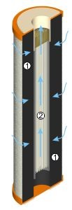 Dieser Integralfilter bietet eine einzigartige Kombination verfügbarer Filtertechniken. Er besteht aus einem Aktivkohlemantel, der ein Paket aus Hohlfasermembranen im Kern umschließt. Die Membranen besitzen eine Porengröße von 0,15 µm (0,00015 mm) und funktionieren ähnlich wie ein Sieb.